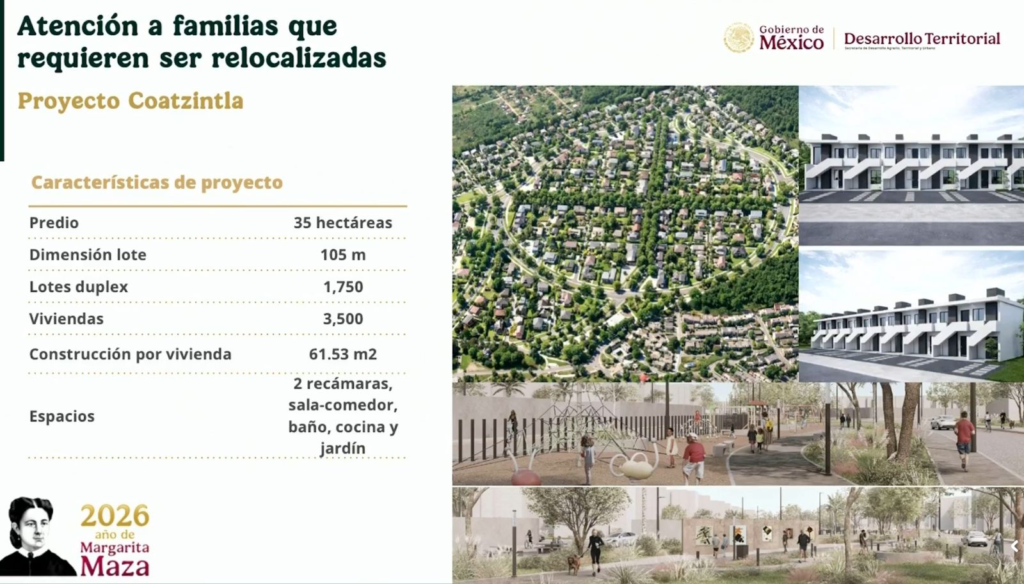 En la reubicación y dentro de la inversión que realizará el Gobierno Federal, el Proyecto Coatzintla contempla la construcción de 3,500 viviendas en un terreno de 35 hectáreas. El lote dúplex contará con 105 m², para la construcción de una vivienda de 61.53 m², que consiste en dos recámaras, sala, comedor, cocina y jardín.