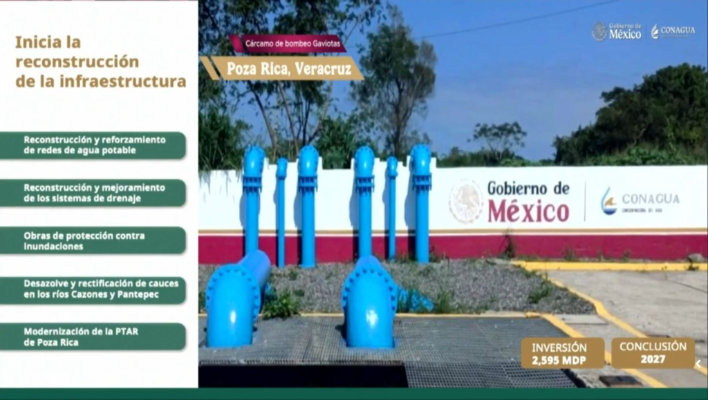 Veracruz, Ver.- Durante su visita a Veracruz, la Presidenta de la República, Claudia Sheinbaum Pardo, destacó una inversión de 2 mil 595 millones de pesos para la zona norte, la mayor inversión será para Poza Rica, con obras como la reconstrucción y reforzamiento de redes de agua potable, reconstrucción y mejoramiento de los sistemas de drenaje, obras de protección contra inundaciones, desazolve y rectificación del cauce del río Cazones y modernización de la Planta Tratadora de Aguas Residuales de Poza Rica.