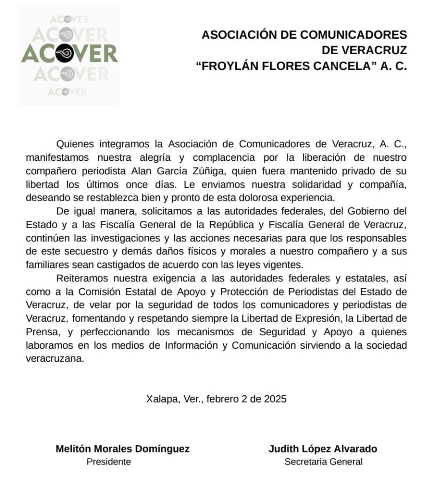 Xalapa, Ver.- La Asociación de Comunicadores de Veracruz “Froylán Flores Cancela” (ACOVER). expresó su satisfacción por la liberación del periodista Alan García Zúñiga, quien permaneció secuestrado durante once días. En un comunicado, la organización manifestó su solidaridad con el comunicador y su familia, deseando su pronta recuperación tras esta difícil experiencia.