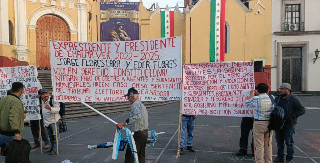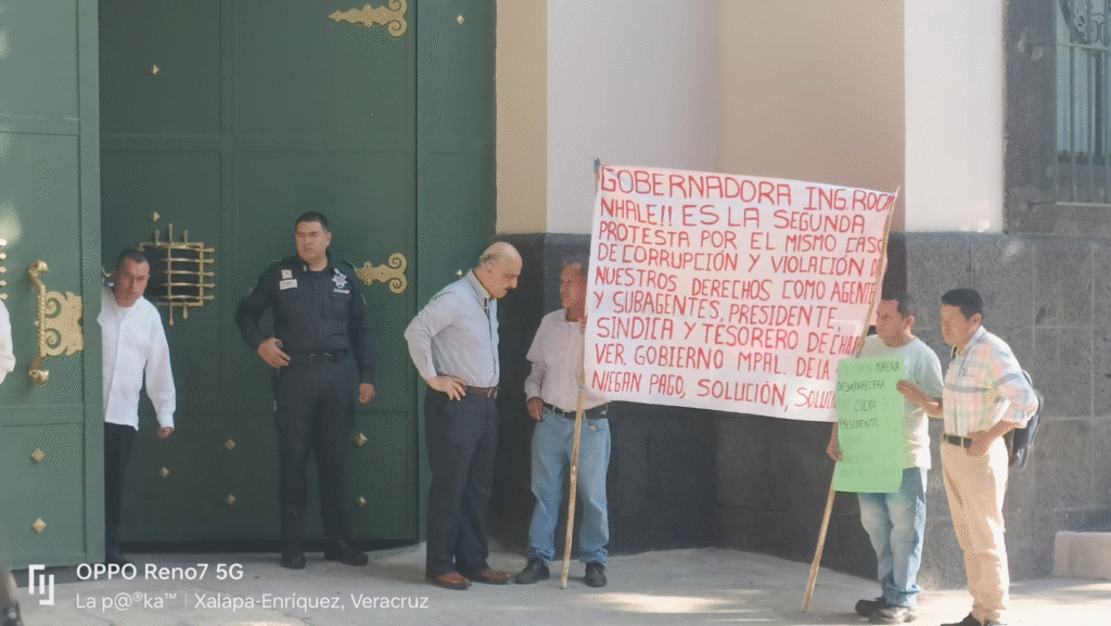 Irineo Pérez Melo.- Agentes y subagentes municipales de Chalma, Veracruz, de nueva cuenta se manifestaron en la Plaza Sebastián Lerdo de Tejada, frente a palacio de gobierno, para denunciar al alcalde Eder Humberto Flores Ortega de no acatar la sentencia emitida por el Tribunal Estatal Electoral de Veracruz de pagar los adeudos salariales que mantienen desde el 2022 al 2025.