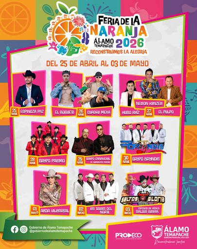 Álamo Temapache, Ver.— El municipio se prepara para una de sus celebraciones más representativas: la Feria de la Naranja 2026, que se llevará a cabo del 25 de abril al 3 de mayo bajo el lema “Reconstruimos la alegría”, con un programa que combina tradición, cultura, espectáculos musicales y actividades recreativas.