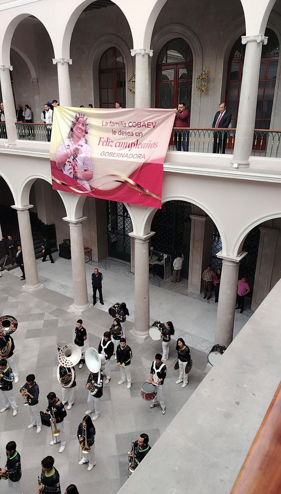 La explanada del recinto oficial se convirtió en el escenario de esta celebración, donde la banda de música “Panteras” ofreció una presentación especial para saludar y reconocer a la mandataria estatal. Con instrumentos en mano y gran energía, las y los jóvenes interpretaron diversas piezas que acompañaron el emotivo momento.