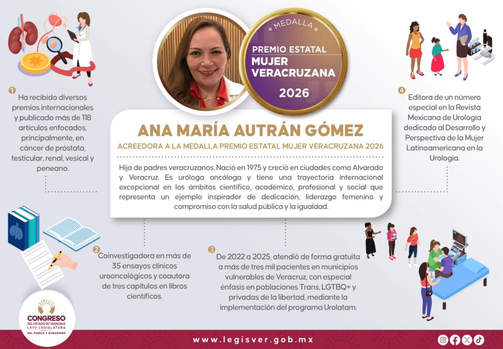 En sesión solemne, la LXVII Legislatura entregará el Premio Estatal a la Mujer Veracruzana 2026 a la ciudadana Ana María Autrán Gómez, por su trayectoria en los ámbitos científico, académico, profesional y social, representando un ejemplo de liderazgo femenino y compromiso con la salud pública y la igualdad.