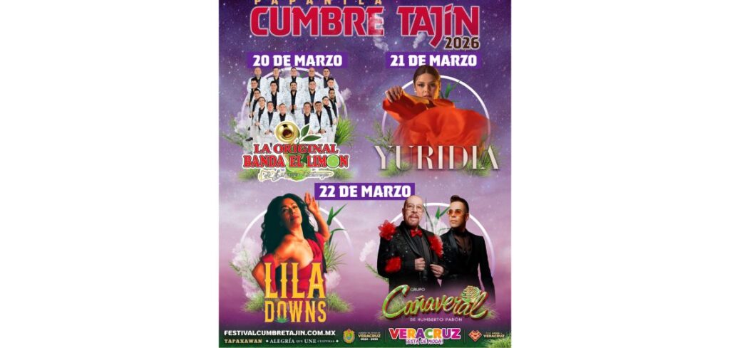 Xalapa, Ver., jueves 26 de febrero de 2026.- La espera terminó, la gobernadora Rocío Nahle García anunció la cartelera oficial de Cumbre Tajín 2026, del 20 al 22 de marzo en el majestuoso municipio de Papantla, corazón del pueblo totonaco y símbolo vivo de raíces ancestrales.