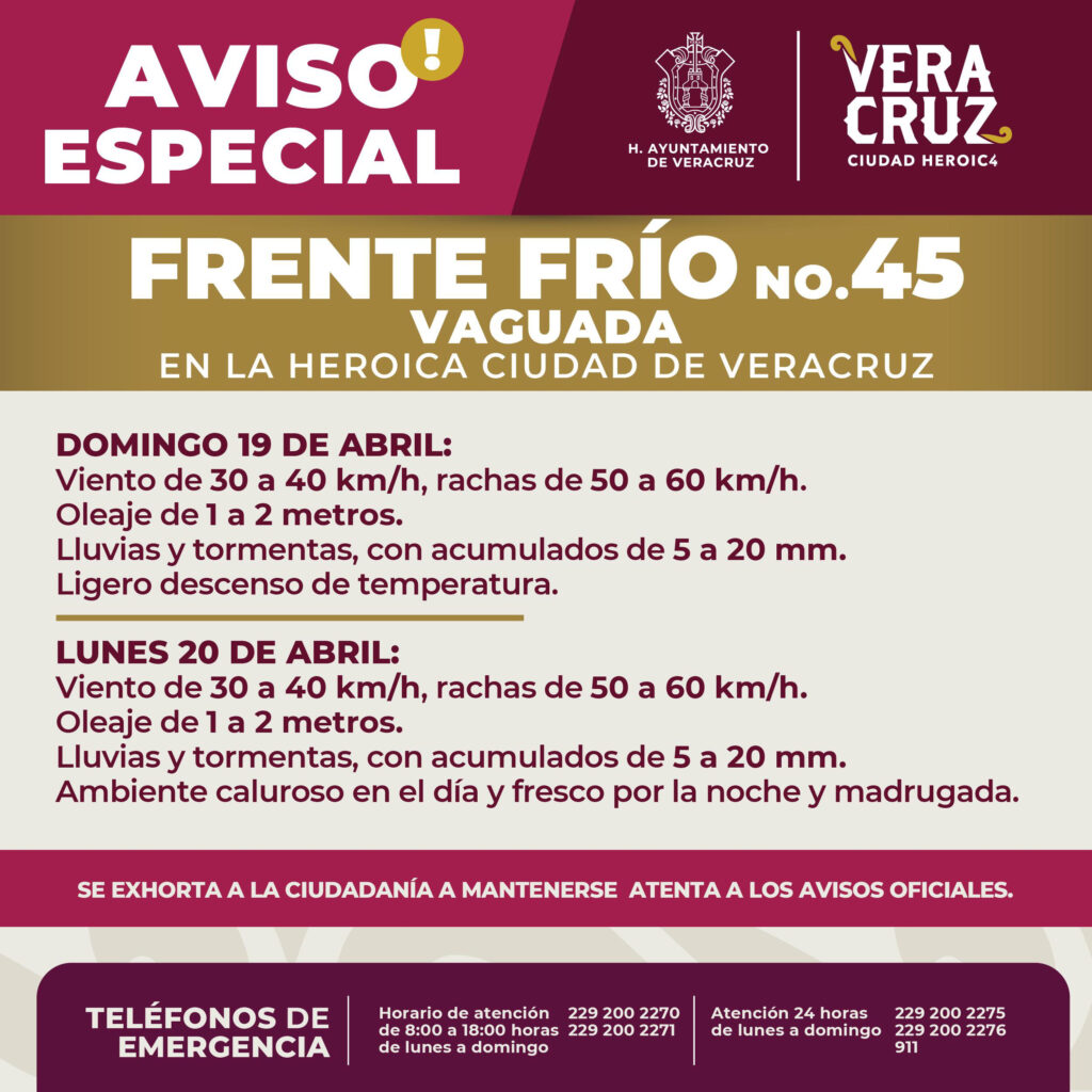 Debido a que durante este domingo 19 y lunes 20 de abril podrían presentarse vientos, lluvias y oleaje elevado por el paso del Frente Frío 45, la dirección de Protección Civil Municipal de Veracruz recomienda a la población tomar precauciones para evitar riesgos.