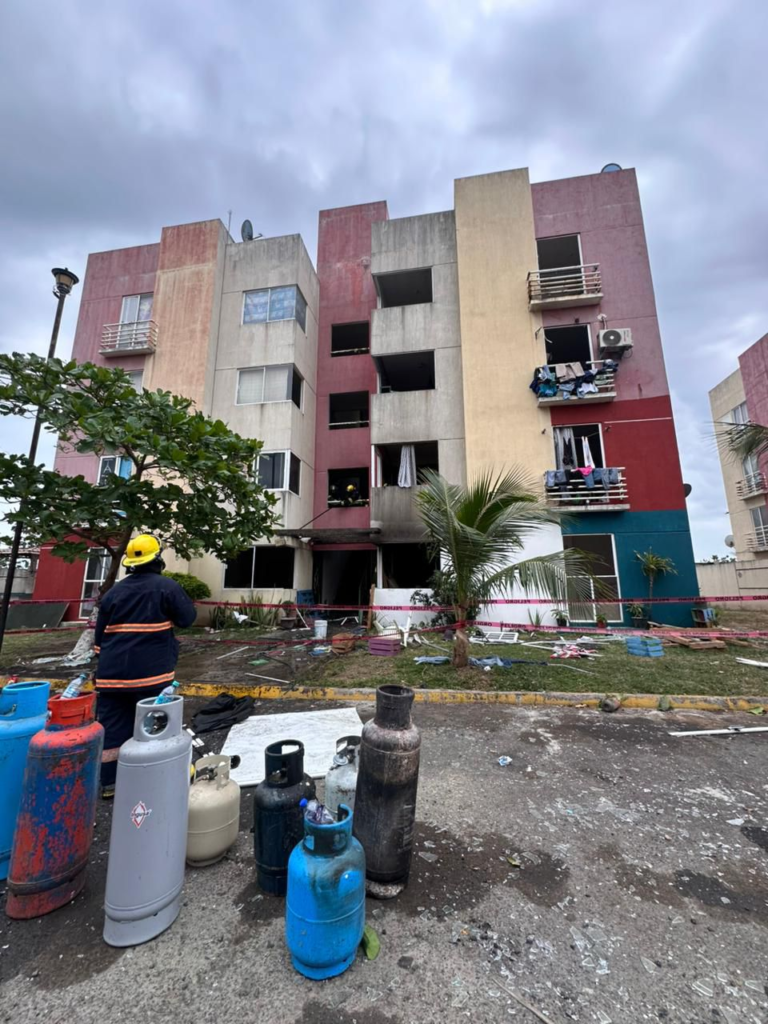 Elementos del Heroico Cuerpo de Bomberos y de Protección Civil municipal de Veracruz realizan labores de enfriamiento en un edificio de departamentos del fraccionamiento Rincón de Palma Real, luego del incendio provocado por una explosión al interior de una de las viviendas, que se extendió al resto del inmueble y fue controlado tras la pronta intervención de las corporaciones.