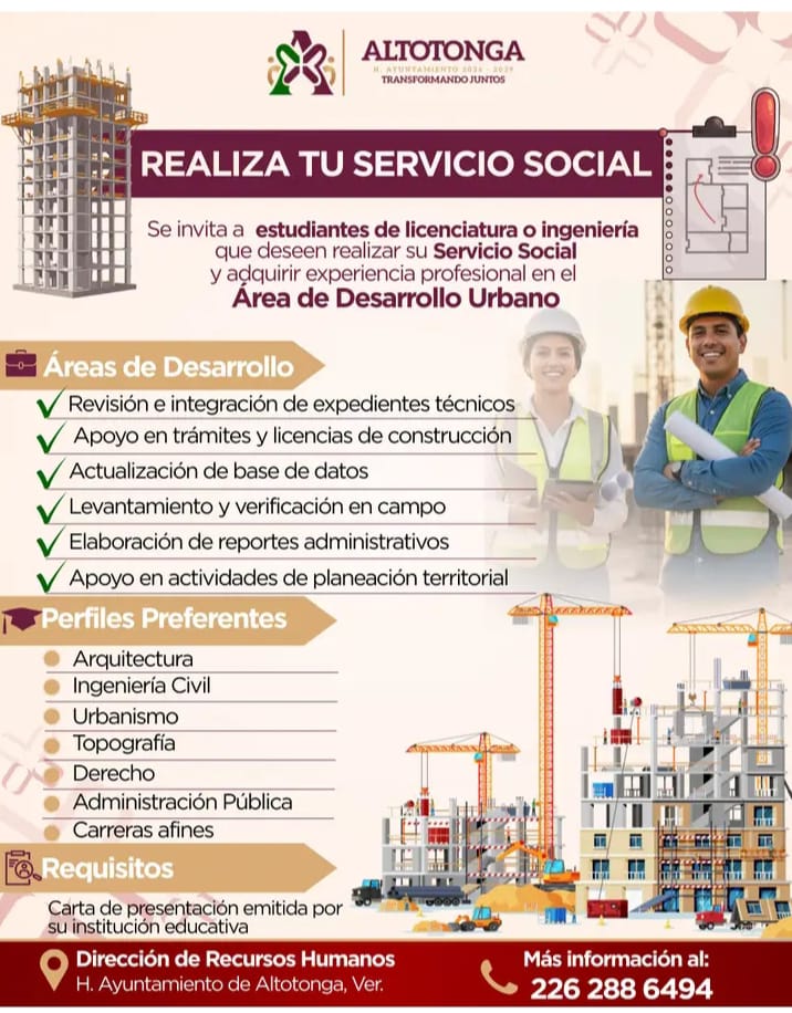 Altotonga, Ver.- El Ayuntamiento de Altotonga convoca a estudiantes de licenciatura o ingeniería interesados en realizar su servicio social en el área de Desarrollo Urbano, donde podrán adquirir experiencia profesional y fortalecer sus conocimientos mediante su participación en proyectos y actividades que contribuyen al crecimiento y ordenamiento del municipio.