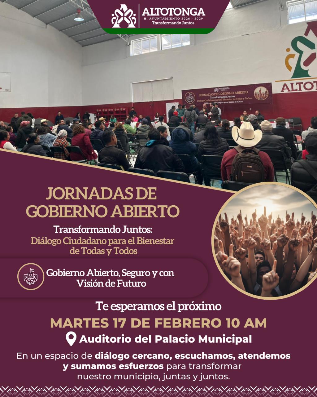 Altotonga, Ver.- El Ayuntamiento de Altotonga invita a la ciudadanía a participar en las Jornadas de Gobierno Abierto, un espacio cercano y directo para dialogar, escuchar y construir juntos soluciones que contribuyan al bienestar y desarrollo del municipio.