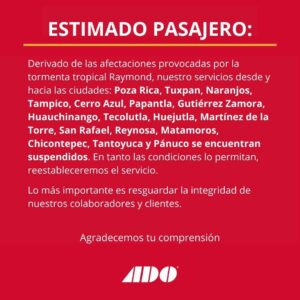 1 min read Información Municipal Principal ADO suspende su servicio en varios municipios de Veracruz, derivado del paso de la tormenta tropical Raymond octubre 10, 2025 Redacción