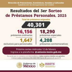 2 min read Principal Asigna ISSSTE más de 40 mil préstamos personales en tercer sorteo del año; 122 por ciento más que en el anterior febrero 2, 2025 Redacción