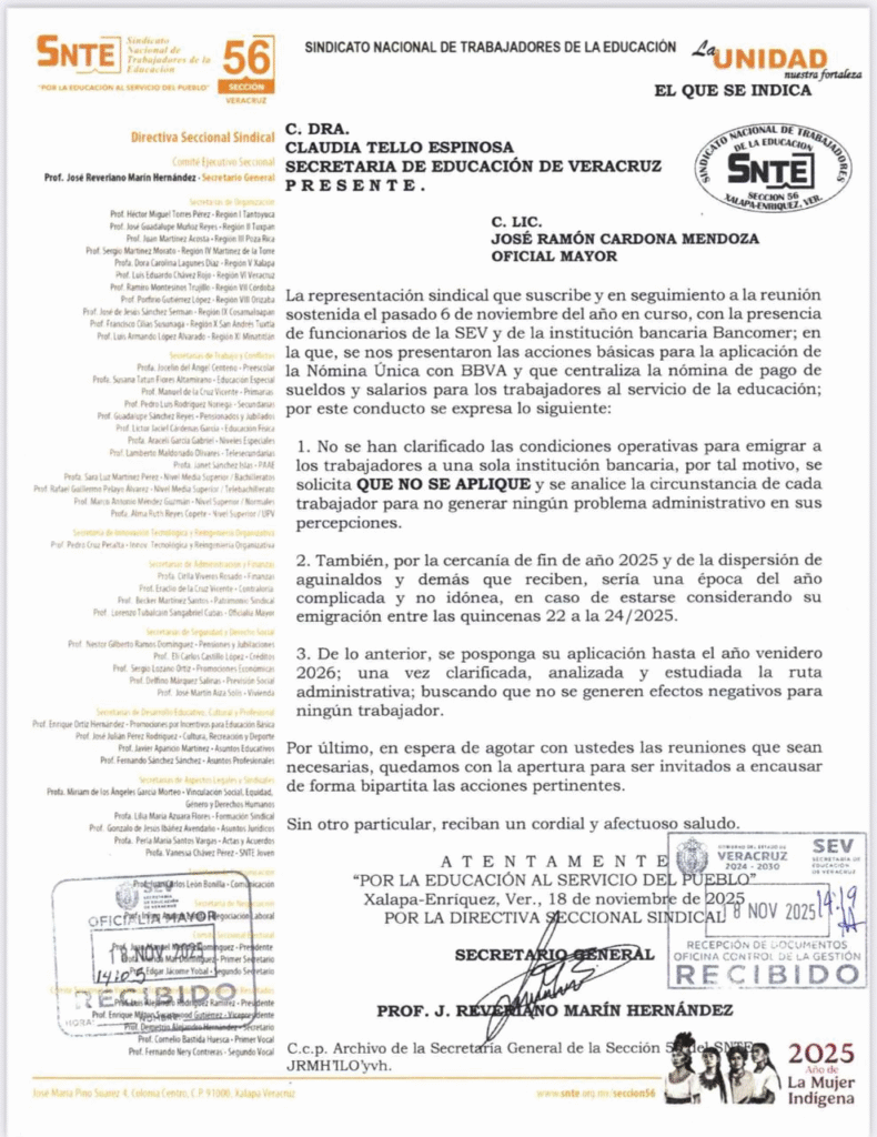 Irineo Pérez Melo.- La Sección 56 del Sindicato Nacional de Trabajadores de la Educación (SNTE) pidió a la titular de Educación de Veracruz (SEV), Claudia Tello Espinoza, posponer hasta el 2026, la aplicación de la centralización de la nómina de pago de sueldos y salarios a trabajadores del sector educativo.