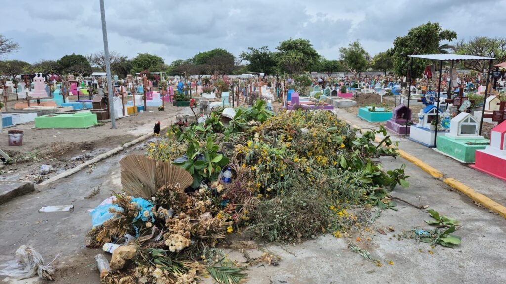 Personal de la dirección de Panteones realizó labores de limpieza en las cinco hectáreas del camposanto, retirando cacharros, floreros con agua estancada y desechos sólidos, además de desmalezado para reducir riesgos sanitarios asociados a la acumulación de agua, basura y vegetación nociva.