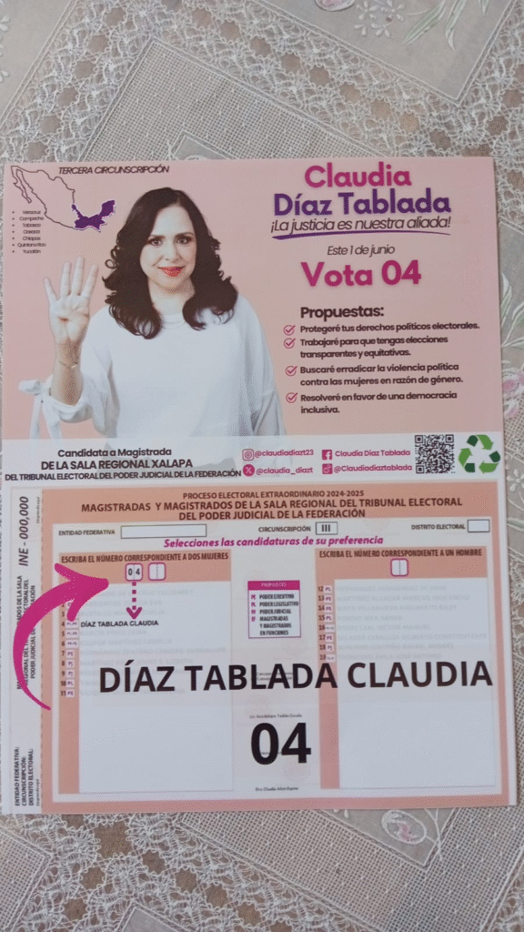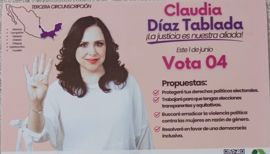 Díaz Tablada, en su campaña, no está cumpliendo con el compromiso hecho de imparcialidad y el respeto a la legalidad, ya que en el actual proceso electoral está participando para poder continuar con el cargo de magistrada y en su publicidad hace la señal de la 4T, lo que la partidiza y, de tajo, rompe con ese compromiso de imparcialidad que hizo siendo autoridad y que deja ver que, de continuar en el cargo, simplemente los expedientes a su estudio y determinación, ya tendrán una tendencia partidista hacia la 4T.