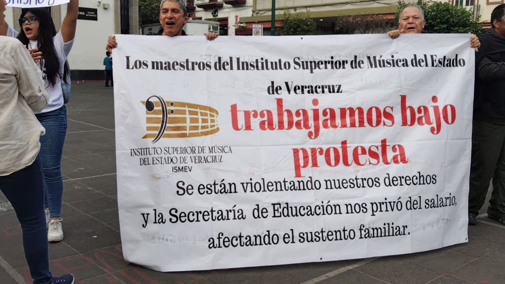 A esta manifestación se sumaron los docentes del Instituto Superior de Música del Estado de Veracruz, quienes mantienen su protesta por lo que consideran una acción arbitraria en su contra al tratar de imponerles la firma de un contrato, desconociendo su antigüedad y profesionalismo, al tratarlos como empleados administrativos por parte de la Secretaría de Educación de Veracruz.