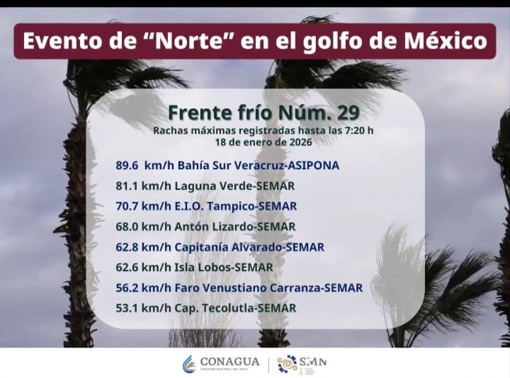 Conagua informa: #Rachas máximas de #Viento registradas esta mañana, en costas de #Veracruz, debido al #EventoDeNorte que afecta zonas del litoral del #GolfoDeMéxico