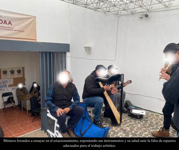 No hay equipos de cómputo, escritorios ni espacios adecuados para el desempeño profesional o la preparación artística, por lo que muchas jornadas transcurren de pie o sentados en el piso, en condiciones impropias para cualquier institución pública.