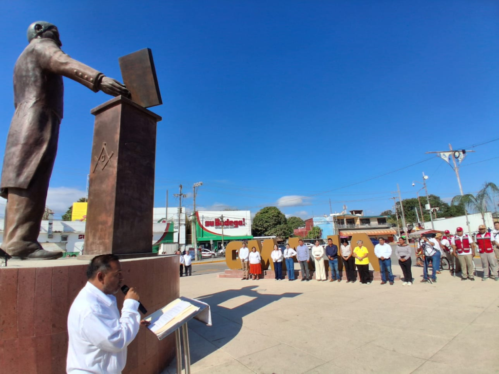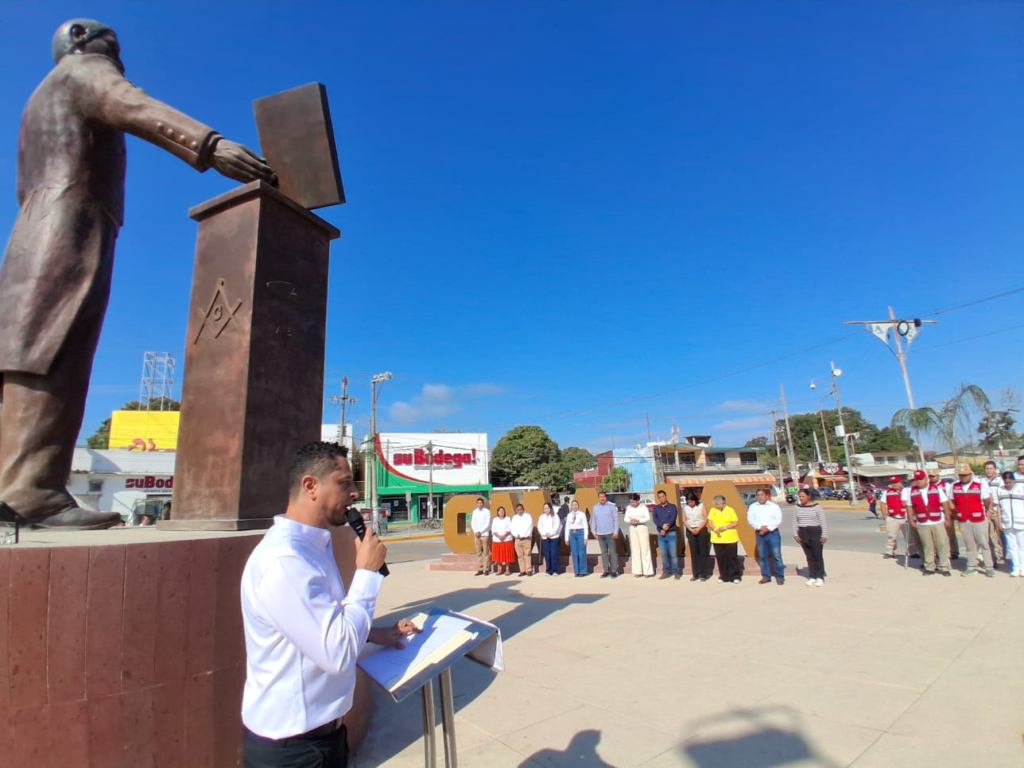 Orador oficial en la ceremonia conmemorativa del 220 aniversario del natalicio de Don Benito Pablo Juárez García, en representación del presidente municipal José Roberto Arenas Benítez, el funcionario precisó que el pensamiento juarista es una guía vigente para la convivencia, para el ejercicio del poder público y para la construcción de una sociedad más justa.