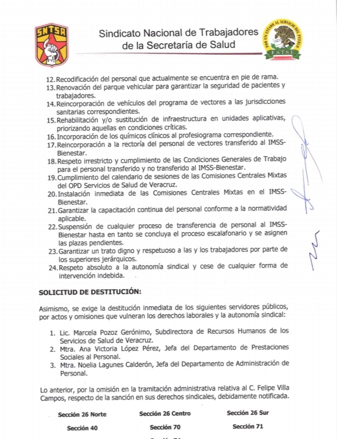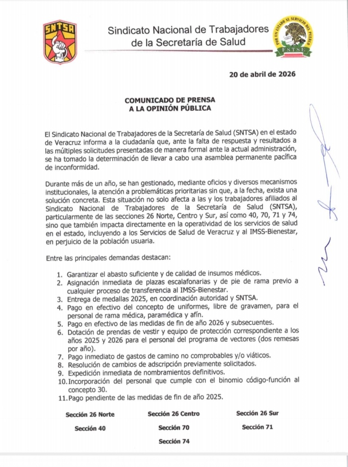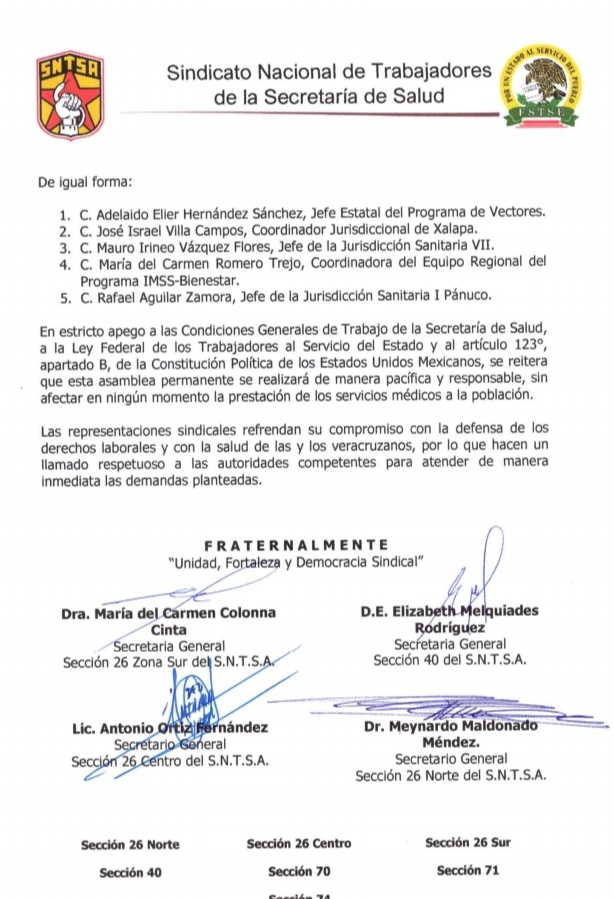 Da inicio a la asamblea en las afueras de la Secretaría de Salud comentando que están abiertos al diálogo donde son respaldados con 20 mil trabajadores solicitando a la Gobernadora del Estado de Veracruz ING Norma Rocío Nahle García su intervención.