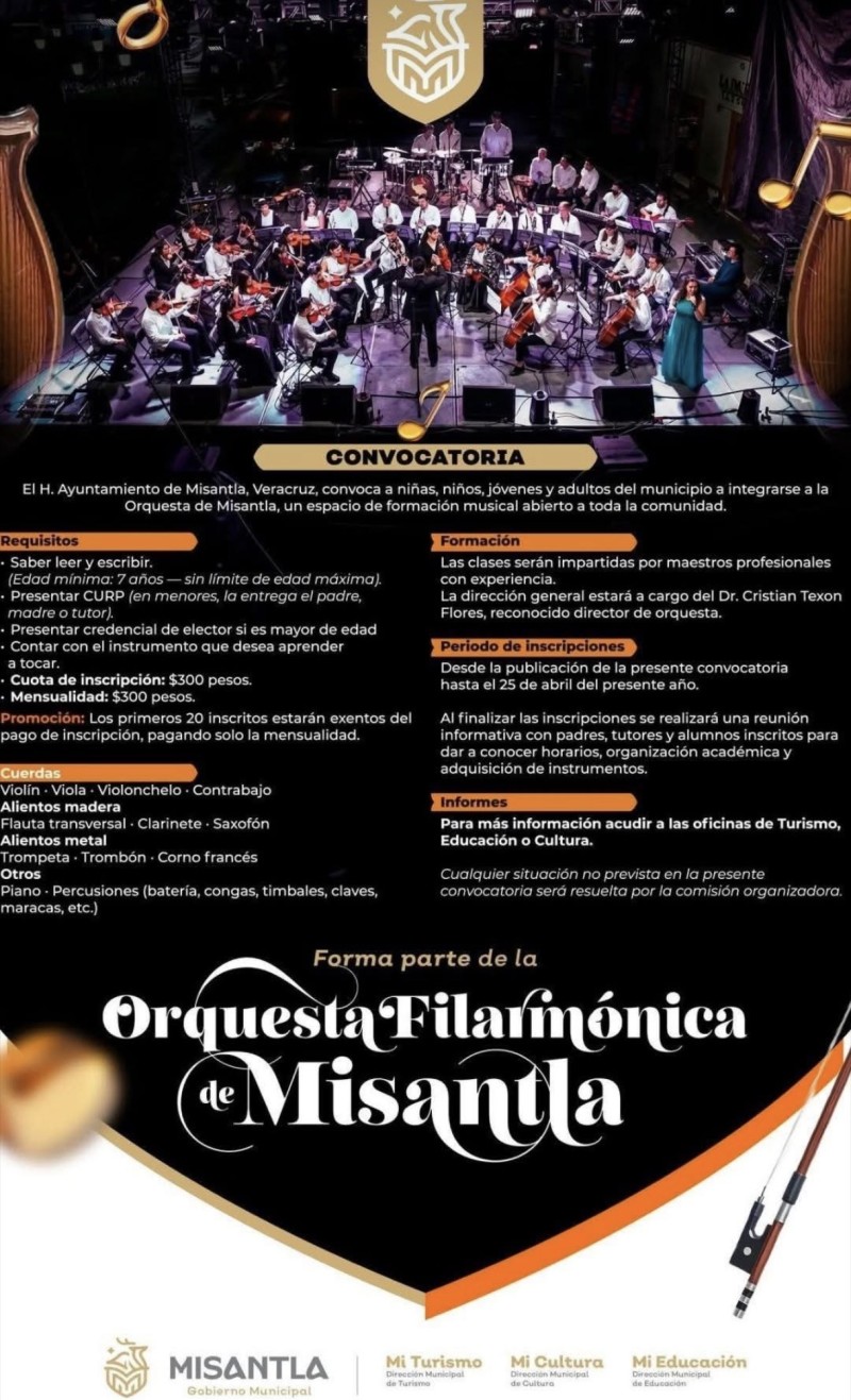 Con el mensaje de que “la música también construye sueños”, el H. Ayuntamiento de Misantla lanzó una convocatoria abierta para que niñas, niños, jóvenes y adultos se integren a la Orquesta Filarmónica del municipio, consolidando así un proyecto que busca fortalecer el talento local y fomentar la formación artística en la región.