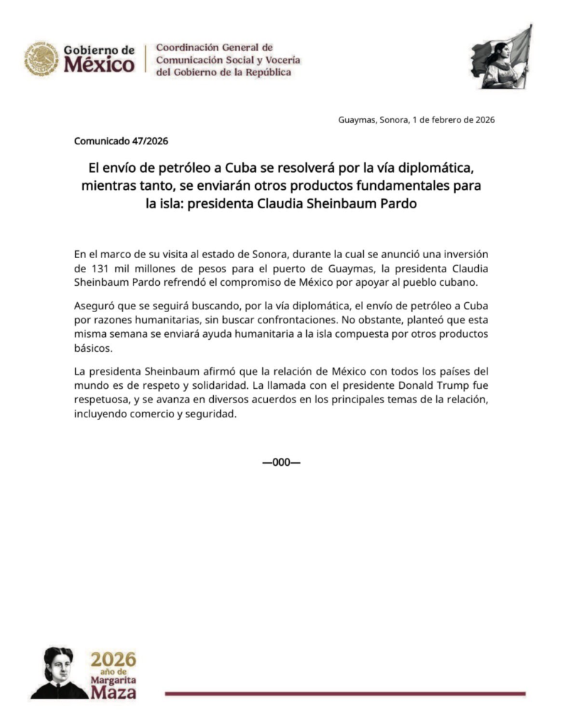 Por conducto de la Secretaría de Marina- Armada de México, el gobierno mexicano enviará ayuda humanitaria a Cuba a partir de esta semana, mientras negocia con el gobierno de los Estados Unidos el envío de petróleo a la isla, afirmó la presidenta Claudia Sheinbaum .