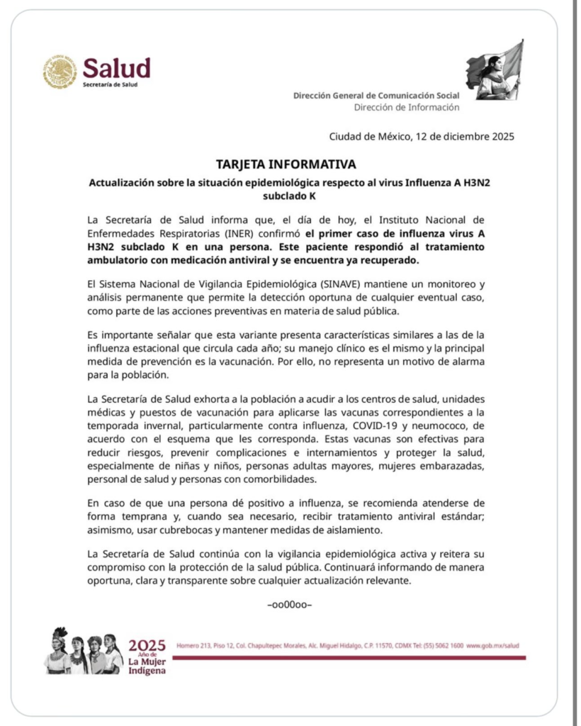 Principal El Instituto Nacional de Enfermedades Respiratorias (INER), confirmó el primer caso de influenza A H3N2 subclado K Redacción diciembre 12, 2025 1 min read Compartir: La Secretaría de Salud informa que el INER confirmó el primer caso de influenza A H3N2 subclado K. La persona respondió al tratamiento antiviral y ya se recuperó. Compartir: Post navigation Previous Normal Veracruzana, Inecol y Colver suman esfuerzos para realizar acciones que mejoren el medio ambienteNext Sin batucadas ni maracas en el PRI estatal Deja un comentario Cancelar respuestaTu dirección de correo electrónico no será publicada. Los campos obligatorios están marcados con *Comentario * Nombre * Correo electrónico * Web Guardar mi nombre, correo electrónico y sitio web en este navegador para la próxima vez que haga un comentario. Historias similares 2 min read Principal Colapso de gradas deja al menos 18 estudiantes lesionados en la UV Xalapa marzo 2, 2026 Redacción , Irineo Pérez 1 min read Principal Pensión Bienestar 2026: este es el calendario oficial marzo 2, 2026 Redacción 1 min read Internacional Principal Dice Trump que líderes de Irán hicieron petición de diálogo:”Quieren hablar y yo he aceptado, así que hablaré con ellos” marzo 1, 2026 Redacción