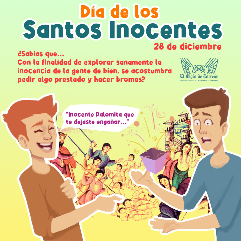 De tal suerte que cada 28 de diciembre en muchos países hispanoparlantes, como México y España, se celebra el Día de los Inocentes y, en esta fecha, se vale hacer bromas o “inocentadas” que empiezan en círculos familiares y de amigos, sin embargo, estas “tomadas de pelo” han trascendido a muchos medios informativos que publican noticias NO verdaderas, pero al final de la nota se pone la leyenda que especifica que hoy es el Día de los Inocentes.