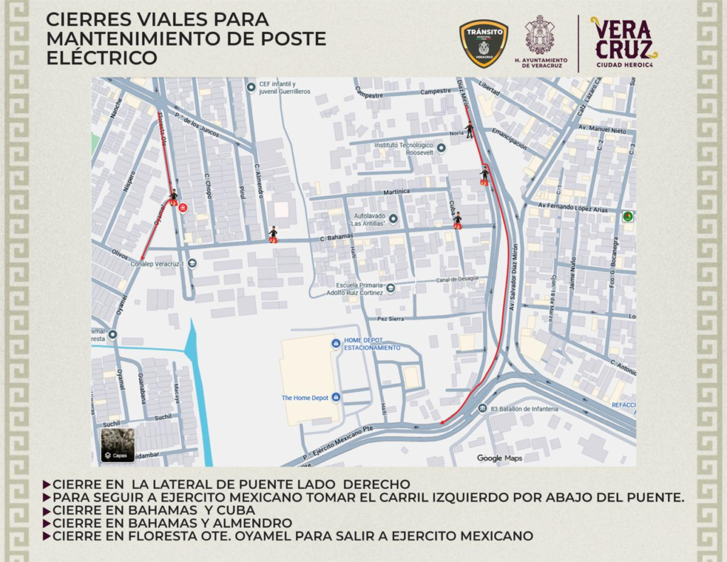 El Ayuntamiento de Veracruz informa a la ciudadanía que hoy, 2 de marzo, a partir de las 14:30 horas, personal de la CFE, acompañado por Protección Civil municipal, realizará el retiro de un poste de energía eléctrica que representa un peligro para los transeúntes en la Av. Salvador Díaz Mirón y Bahamas, en la colonia Las Antillas, por lo que se aplicarán los siguientes cierres viales: