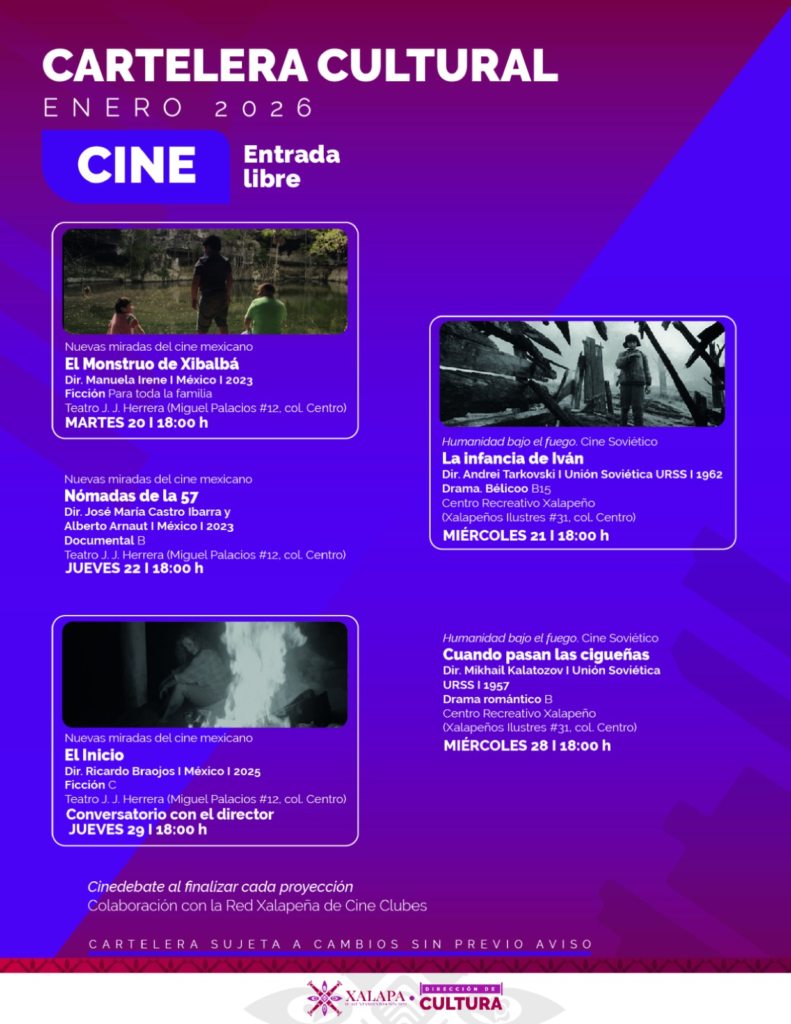 En el Teatro J. J. Herrera, el próximo martes a las 18:00 horas, se proyectará “El Monstruo de Xibalbá”, y el jueves 22 de enero, “Nómadas de la 57”. El jueves 29 de enero se exhibirá “El Inicio”. En el CRX, los miércoles, a las 19:00 horas, se proyectarán las películas “La infancia de Iván” y “Cuando pasan las cigüeñas”, como parte del ciclo “Humanidad bajo fuego, cine soviético”.