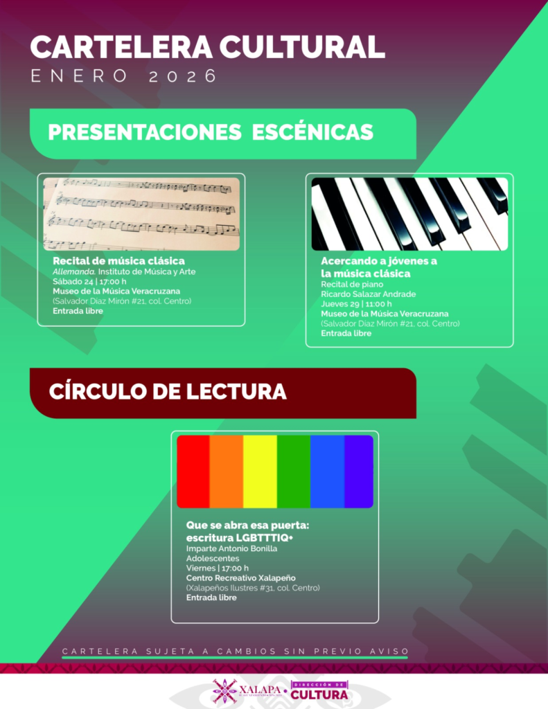 Xalapa, Ver., 16 de enero de 2026.- Talleres, cine, música y más incluye la agenda cultural que organiza el Ayuntamiento de Xalapa para recreación de las familias, en distintos recintos y espacios públicos.