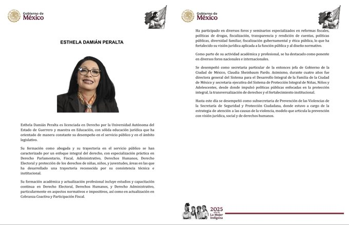 “Su formación como abogada y su trayectoria en el servicio público se han caracterizado por un enfoque integral del derecho, con especialización práctica en Derecho Parlamentario, Fiscal, Administrativo, Derechos Humanos, Derecho Electoral y protección de los derechos de niñas, niños, y juventudes, áreas en las que ha desarrollado una trayectoria reconocida por su consistencia técnica e institucional”, menciona un comunicado del Gobierno de México” dice el comunicado oficial.