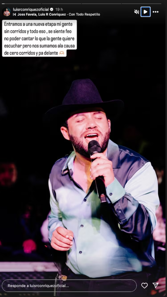 “Entramos a una nueva etapa mi gente, sin corridos y todo eso. Siento feo no poder cantar lo que la gente quiere escuchar, pero nos sumamos a la causa de cero corridos pa delante”, fue el mensaje que el cantante publicó en sus redes sociales horas antes de salir a cantar en la Feria del Caballo de Texcoco.