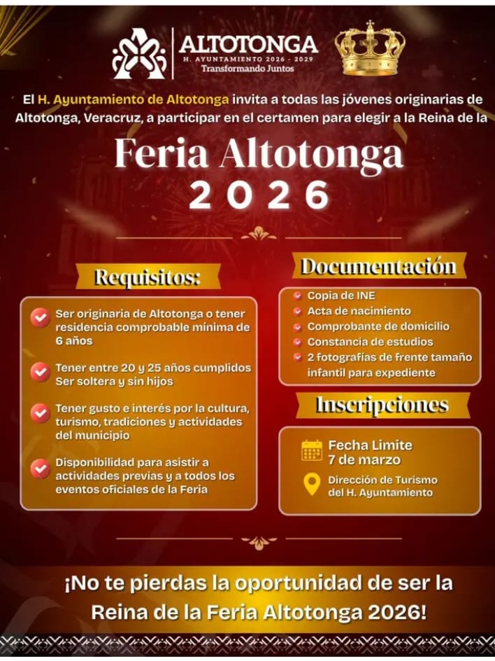 Altotonga, Ver.- La Feria Altotonga 2026 representa una gran oportunidad para que las jóvenes del municipio participen activamente en una de las celebraciones más representativas de la región, mostrando con orgullo las tradiciones, cultura e identidad altotonguense.