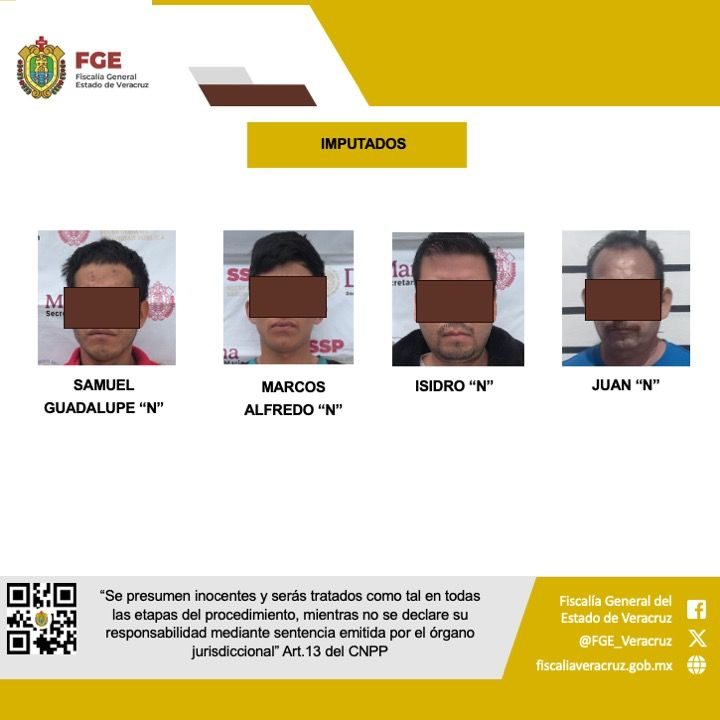 Por su parte, la Fiscalía Regional Córdoba reportó que, en Huatusco, el órgano jurisdiccional decretó de legal la detención y formuló la imputación en contra de Samuel Guadalupe “N”, Marcos Alfredo “N” e Isidro “N”, como presuntos responsables del delito de homicidio doloso calificado. De acuerdo con los hechos integrados en el proceso penal 25/2026, el 11 de marzo del año en curso, en la colonia Reserva Territorial de ese municipio, presuntamente agredieron a la víctima utilizando armas blancas, ocasionándole lesiones que derivaron en su fallecimiento. En consecuencia, el juez impuso como medida cautelar la prisión preventiva justificada.
