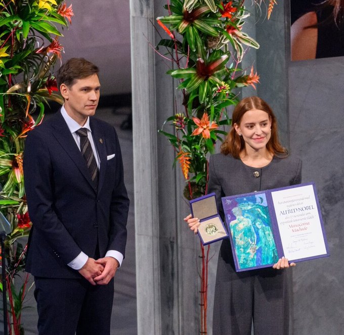 En una llamada con el presidente del Comité Noruego del Nobel, Jørgen Watne Frydnes, divulgada por la organización justo antes de la gala, María Corina Machado se dijo “muy triste” y afirmó que “sentía mucho” no llegar a tiempo para la ceremonia.