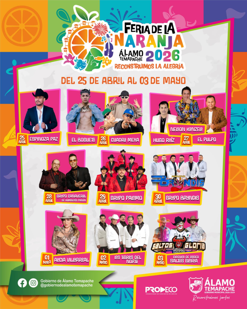 ÁLAMO, VER.- Tras semanas de expectación, el gobierno municipal que preside Pepe Arenas anunció la impresionante cartelera musical y artística para la Feria de la Naranja 2026, que será gratuita, incluyente y pensada para todas las familias, pero también diseñada para detonar la economía del municipio.