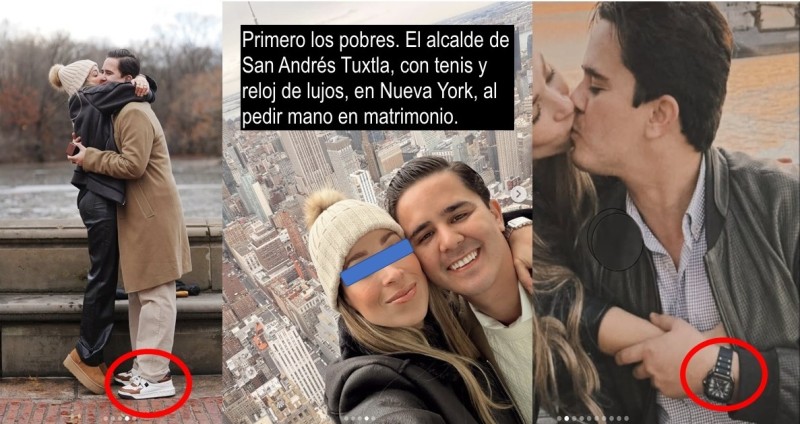 Austeridad republicana, pobreza franciscana. Hipocresía. Puro Cuento. El periodista tapatío Jorge García Orozco, colaborador de EmeEquis, publicó ayer jueves en su cuenta de X que el alcalde morenista de San Andrés Tuxtla, Rafael Fararoni, viajó hacia la Urbe de Hierro, Nueva York, para proponer lazo matrimonial a su novia, además calzando unos zapatos tenis Valentino de 16 mil pesos (790 euros), y también publicó otra imagen donde se le ve portando un reloj Santos de Cartier de más de 201 mil pesos. En Morena, sin duda, primero los pobres.