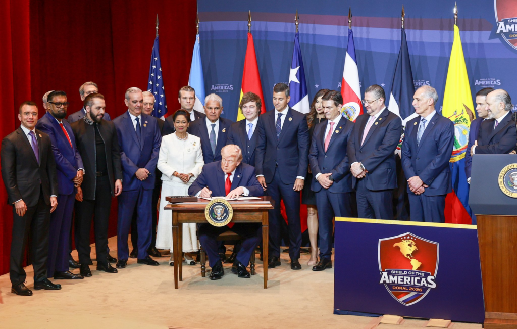 La cumbre “Escudo de las Américas” encabezada por Donald Trump el 7 de marzo de 2026 en Miami que anunció una coalición militar de 12 países para “erradicar” los carteles del narcotráfico, excluyendo deliberadamente a México, Brasil, Colombia y Cuba —los principales productores y corredores de droga— lo que genera escepticismo sobre su efectividad real y refleja una estrategia ideológica que prioriza alineación política sobre cooperación técnica, mientras el presidente Trump ironizó públicamente que la presidenta Claudia Sheinbaum rechazó su oferta de enviar tropas estadounidenses a territorio mexicano.
