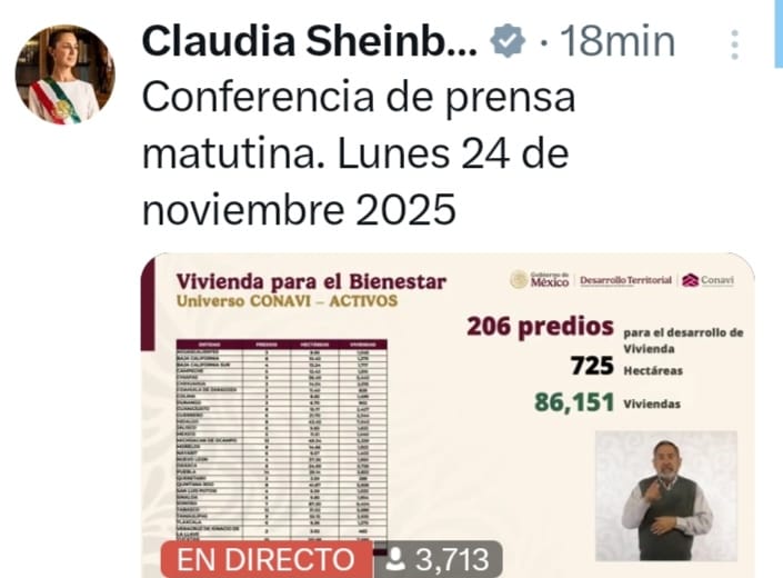 Principal La Mañanera del 24 de noviembre 2025 Redacción noviembre 24, 2025 1 min read Compartir: #MañaneraDelPueblo desde Palacio Nacional. Lunes 24 de noviembre 2025 https://t.co/KNAhbj9DC1— Gobierno de México (@GobiernoMX) November 24, 2025 Compartir: Post navigation Previous Crimen enturbia gira de SheinbaumNext Catorce acciones por la paz para el país entero, plantea CEM Deja un comentario Cancelar respuestaTu dirección de correo electrónico no será publicada. Los campos obligatorios están marcados con *Comentario * Nombre * Correo electrónico * Web Guardar mi nombre, correo electrónico y sitio web en este navegador para la próxima vez que haga un comentario. Historias similares 1 min read Principal La CFE hace oídos sordos a denuncia ciudadana noviembre 26, 2025 Redacción 1 min read Principal Banco de México redujo a la mitad su expectativa de crecimiento del PIB para 2025 noviembre 26, 2025 Redacción 2 min read Información Municipal Principal Veracruz En veracruz puerto avanza construcción del Plan Municipal de Desarrollo 2026–2029 noviembre 26, 2025 Redacción