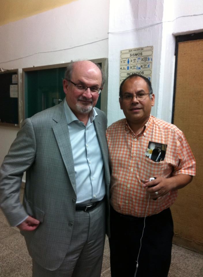 Estuve muy cerca de la visita de Salman Rushdie a Xalapa el 4 de octubre de 2014. Fue muy complejo todo el dispositivo de seguridad; entre otros requisitos, se pedía evitar el mayor número posible de fotos con el escritor. Tuve la gran oportunidad de conversar con él sobre el precio que le impuso el gobierno de Irán y, claro, de obtener la fotografía correspondiente.