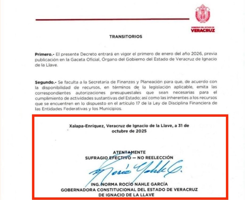 (Ya un poco tarde la noche de este lunes, a punto de despachar “Prosa aprisa”, mi compañero columnista Oved Contreras subió a las redes un fragmento facsimilar del proyecto de decreto del Presupuesto de Egresos para el Ejercicio Fiscal 2026, en cuyo Artículo 43 está contenido el cuadro de percepciones en el que se incluye el aumento salarial a la gobernadora Rocío Nahle, que por la mañana ella dijo que desconocía. Pero resulta que el documento, ¡lo firmó ella misma!, con fecha 31 de octubre pasado. Oved pregunta, con razón: ¿Quién firma sin leer el contenido de un documento? Por la hora, la columna la dejó íntegra como ya la tenía redactada).