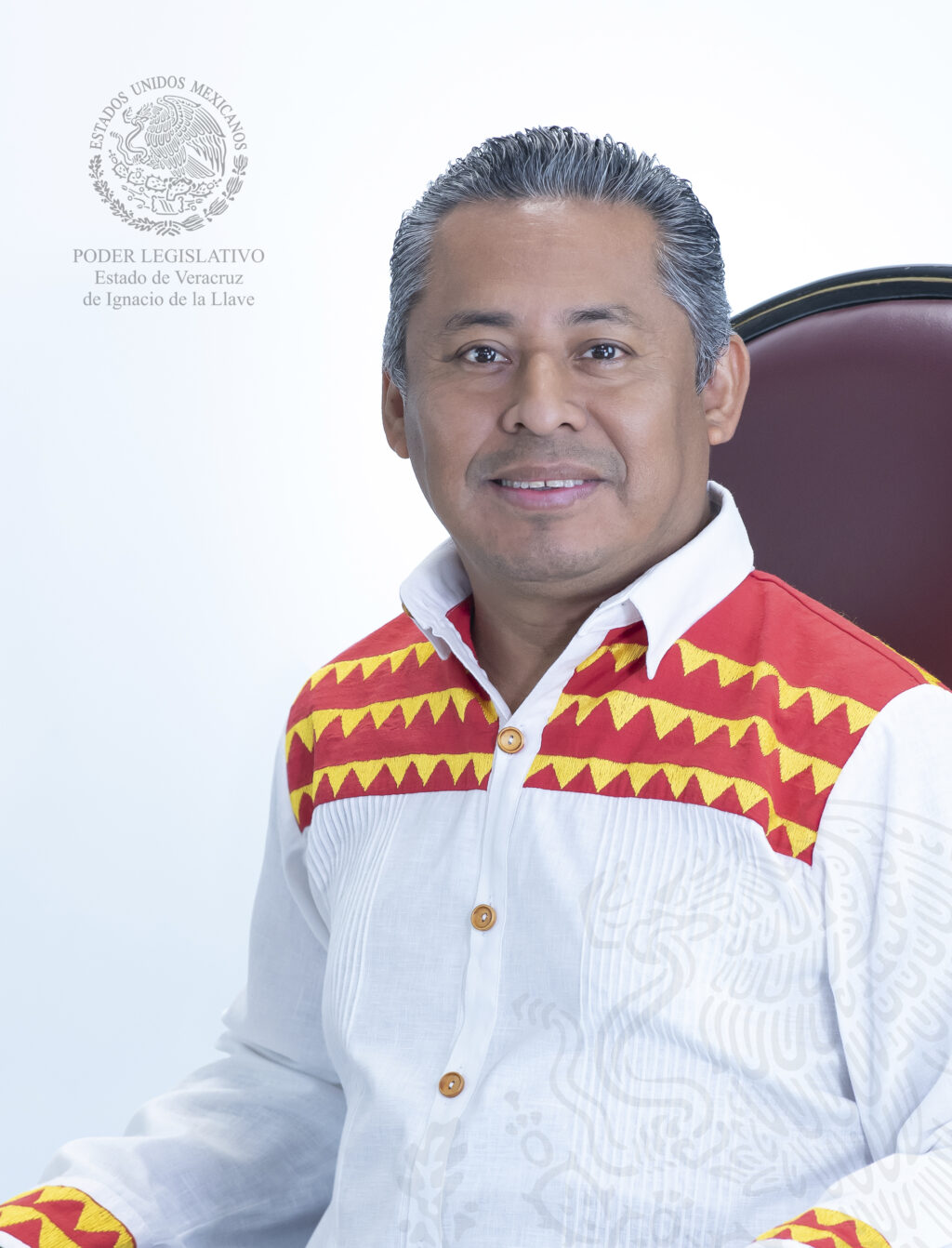 Estoy con el diputado local del PVEM por el distrito de Acayucan, Urbano Bautista Martínez, quien se ha caracterizado por llevar un tipo de camisa a todas las sesiones legislativas. Es un atuendo blanco de lino con bordados en rojo y naranja.