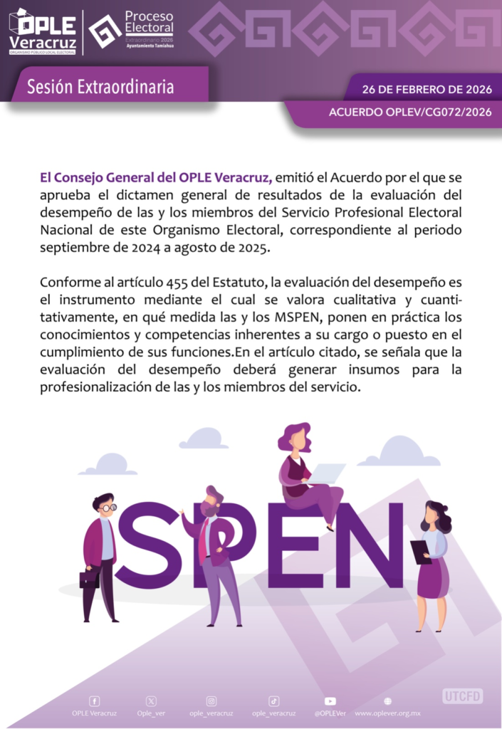 Xalapa, Ver., 26 de febrero 2026.- En sesión extraordinaria, el Consejo General del Organismo Público Local Electoral del Estado de Veracruz (OPLE Veracruz) aprobó la cuenta pública del ejercicio fiscal 2025.