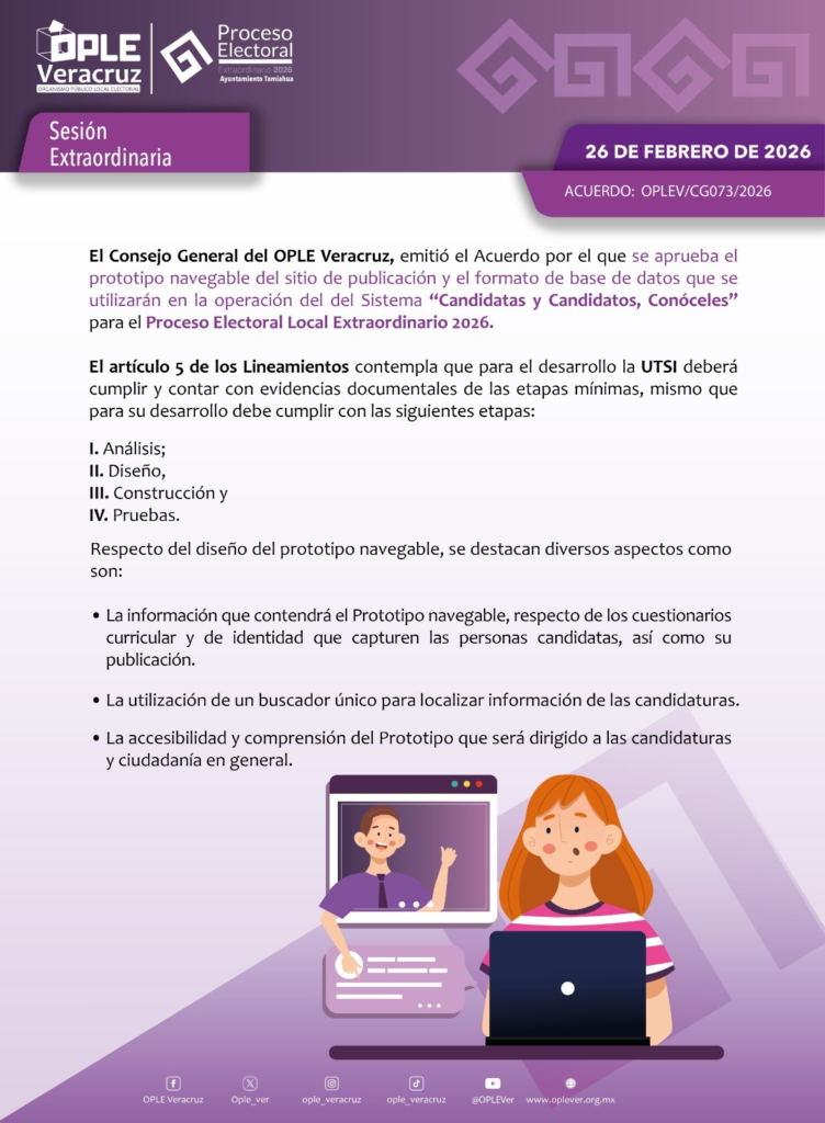En el marco del Proceso Electoral Local Extraordinario 2026 (PELE 2026) para la elección del Ayuntamiento del Municipio de Tamiahua, se aprobó el prototipo navegable del sitio de publicación y el formato de base de datos que se utilizarán en la operación del Sistema “Candidatas y Candidatos, Conóceles”, así como el Manual de usuario de este mismo.