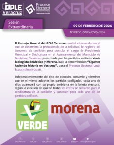 OPLE Veracruz recibe solicitud de convenio de coalición Morena-PVEM para la elección del ayuntamiento del municipio de Tamiahua