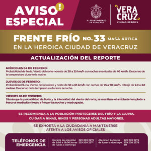 1 min read Información Municipal Veracruz Mantiene Protección Civil de Veracruz Aviso Especial previo a ingreso de Frente Frío No.33 febrero 4, 2026 Redacción