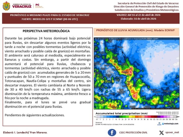 PC: Pronóstico a mediano plazo para el estado de Veracruz; domingo incrementa potencial de lluvias, chubascos y tormentas