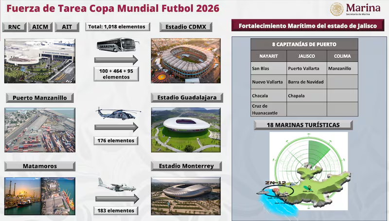 El general Román Villalvazo Barrios, jefe del Centro de Coordinación del Mundial, explicó que el plan se basa en un sistema de cinturones de seguridad para proteger instalaciones clave como aeropuertos, hoteles, estadios, zonas de entrenamiento y áreas de Fan Fest.