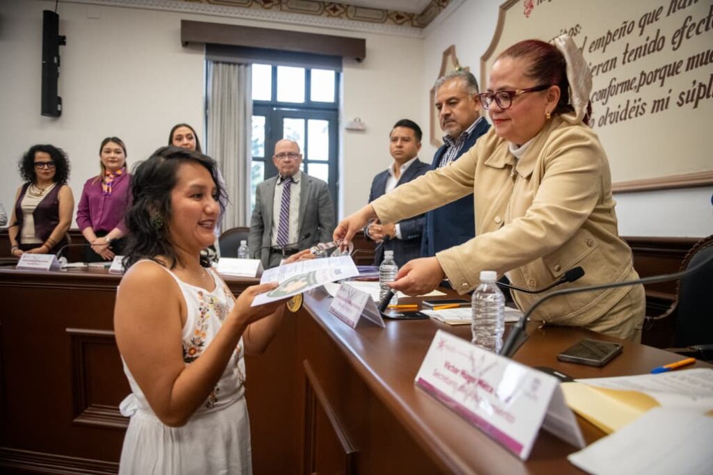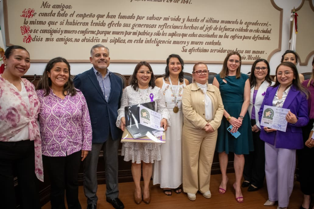 En el marco de la conmemoración del Día Internacional de la Mujer, ante el Síndico Único, Dr. Marco Aurelio Martínez Sánchez, y el Secretario del Ayuntamiento, Mtro. Víctor Hugo Meza Cruz, se otorgó la presea a María del Rosario Contreras Flores y Beu Ribe Yantlanesi Hernández Hernández, integrantes de Mujeres Sembrando Esperanza y la Colectiva de Familias Cuidadoras de Niñeces con Parálisis Cerebral y Neurodiversidad Funcional.