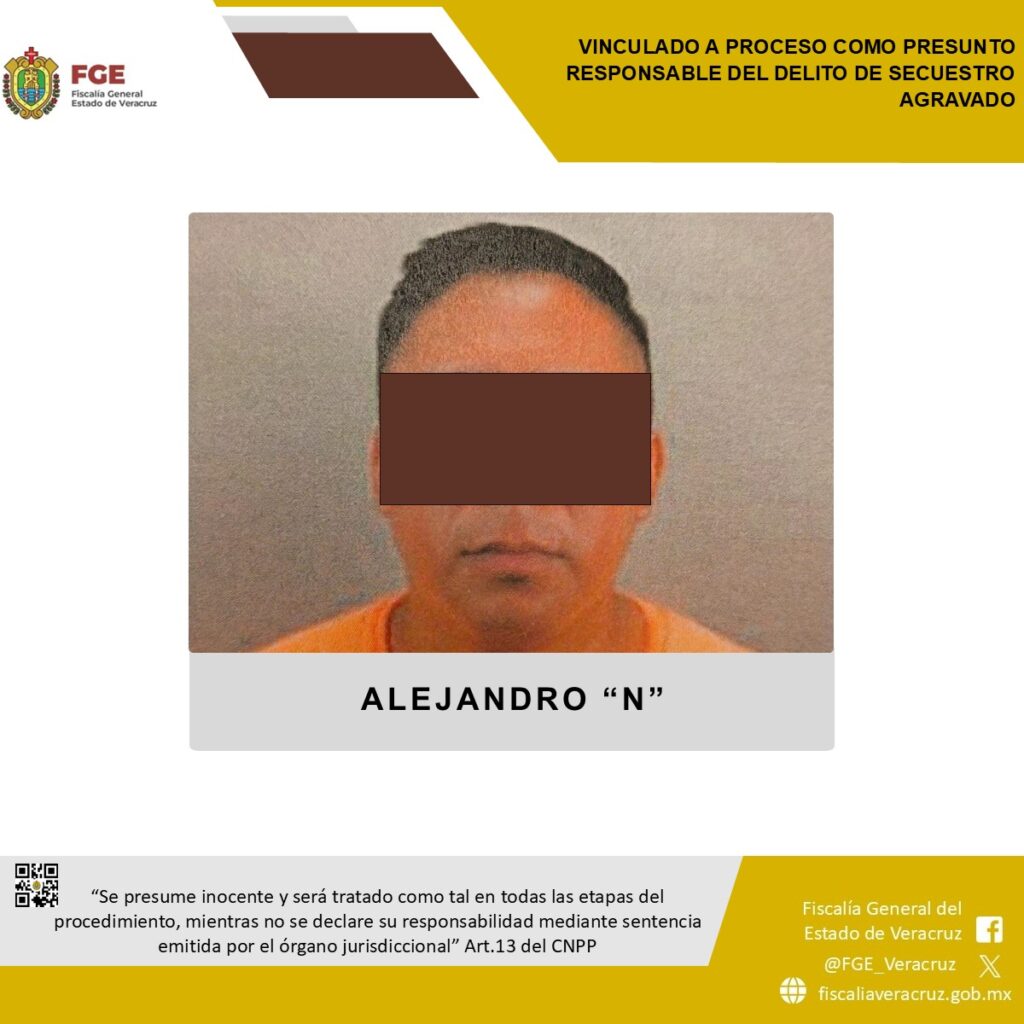 Xalapa, Ver.- Como resultado de acciones de investigación, la Fiscalía General del Estado de Veracruz, a través de la Fiscalía de Investigaciones Ministeriales, reportó la vinculación a proceso otorgada por el órgano jurisdiccional en contra de Alejandro “N”, ex servidor público, señalado como presunto responsable del delito de secuestro agravado en Tierra Blanca, cometido en agravio de dos víctimas de origen hondureño, cuya identidad se encuentra legalmente resguardada.