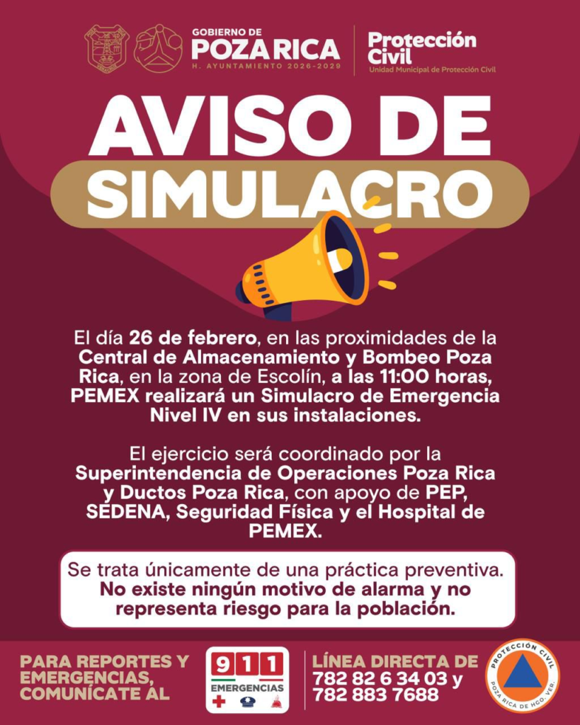 En Corto Información Municipal Poza Rica Protección Civil de Poza Rica informa sobre simulacro a efectuarse este jueves 26 de febrero Redacción febrero 26, 2026 1 min read Compartir: Compartir: Post navigation Previous Mañanera del 26 de febrero 2026Next Nuevo ultrasonido beneficia a más de 18 mil derechohabientes del ISSSTE en Cárdenas, Tabasco Deja un comentario Cancelar respuestaTu dirección de correo electrónico no será publicada. Los campos obligatorios están marcados con *Comentario * Nombre * Correo electrónico * Web Guardar mi nombre, correo electrónico y sitio web en este navegador para la próxima vez que haga un comentario. Historias similares 2 min read Álamo Información Municipal El Sistema DIF Municipal de Álamo informa que en marzo iniciarán las Jornadas Médicas en las comunidades febrero 26, 2026 Redacción 3 min read Álamo Información Municipal Principal Álamo recupera el ánimo y la confianza por la reconstrucción y el desarrollo febrero 26, 2026 Redacción 2 min read Información Municipal Principal Xalapa Con más de 60 horas acumuladas de diálogo directo, se realizó la octava Jornada del Día del Pueblo febrero 26, 2026 Redacción